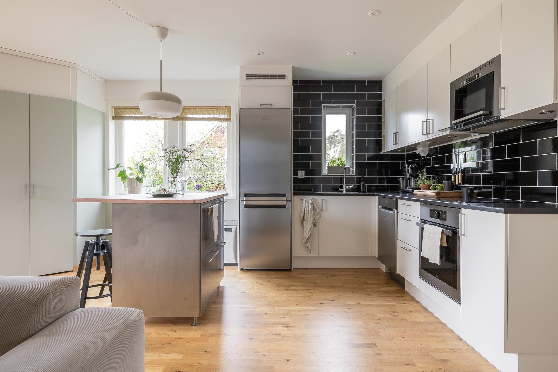 Utrustning i kök: Köksö, dubbel ho, ugn, induktionshäll, fläkt, inbyggd micro, diskmaskin, kombinerad kyl och frys.